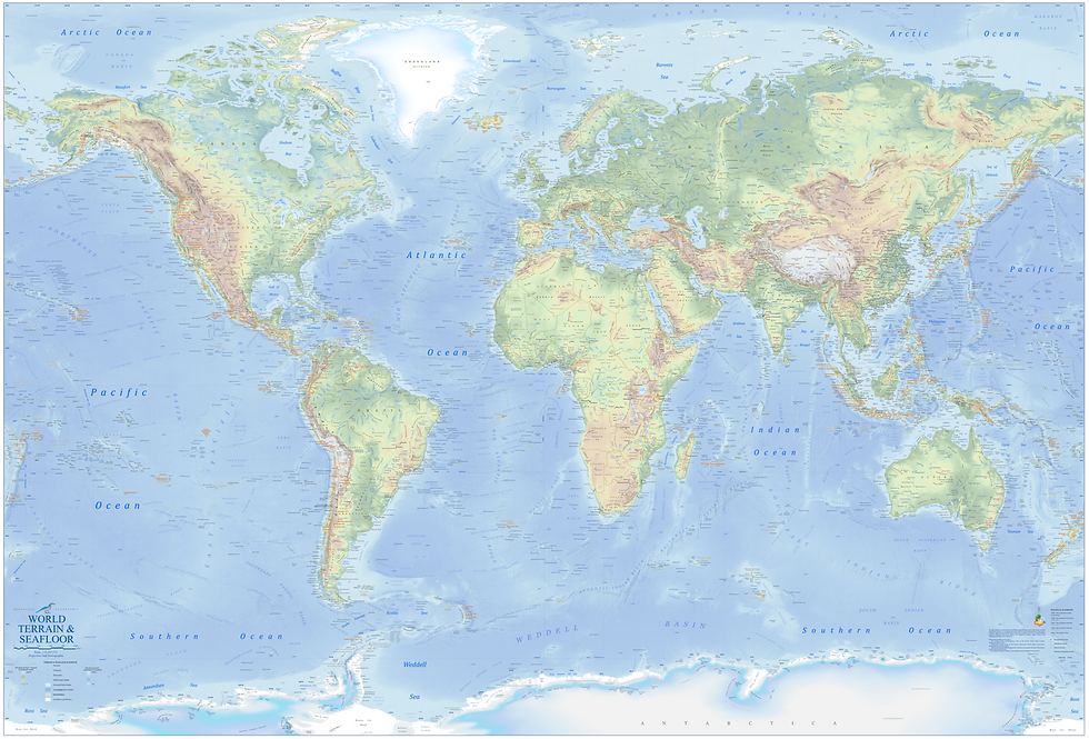 After producing polished first drafts of seven continental Terrain & Seafloor maps, I aggregated the imagery, data, labeling, and research that went into the production of all seven continental maps into a single World Terrain & Seafloor map, which I now sell as my flagship product. The difficult and highly detailed terrain maps of the United States and the U.S. State of Florida, both rich in conservation and recreational elements, were the most recently-completed products.